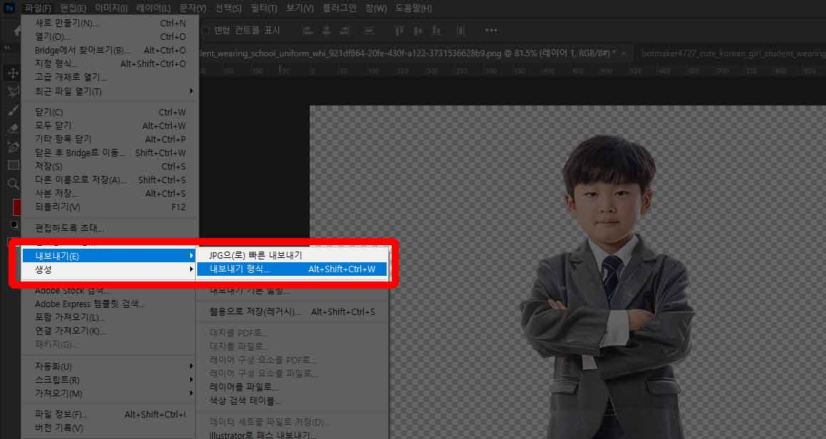 설정이 완료된 후, [ 내보내기 → 내보내기 형식 ]으로 다시 들어가서 변경된 설정을 확인합니다. 이제 파일 형식 목록에 SVG 옵션이 추가된 것을 확인할 수 있습니다. 이를 통해 포토샵에서도 벡터 형식인 SVG 파일로 저장할 수 있습니다.